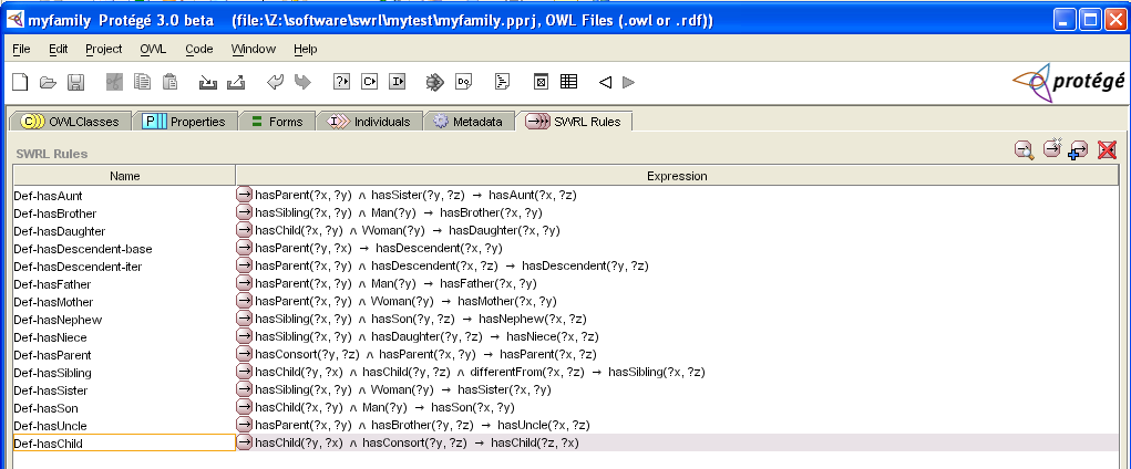 Version: 2005-02-12 Update: 2005-06-27 Goal: This is a prototype system to support reasoning with SWRL rules in