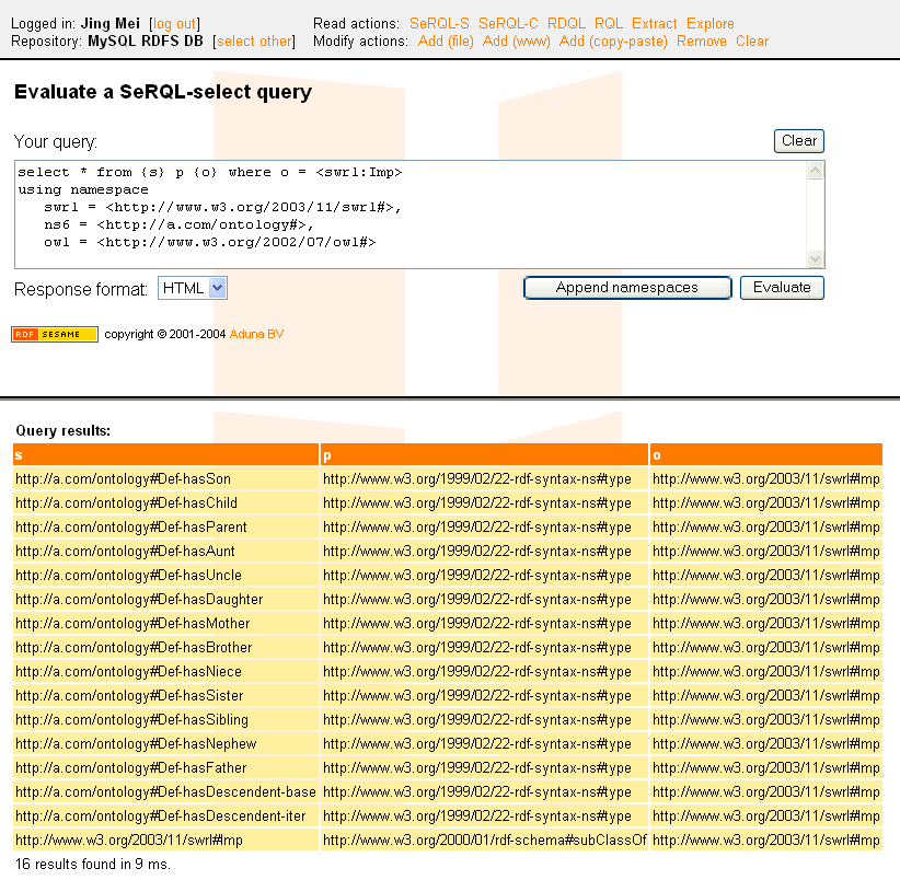 version of the engine, yet it is subject of future work. Sesame, an RDF database, acts as an RDF store for the initial ground triples as well as for the derived consequences. For testing purposes, we use the "family" SWRL file from the Protege ontology library. Further on we borrow a figure from a paper of Christine Golbreich to illustrate this file. In our use case we extend the12 rules provided in the original file with the recursive rules "Def-hasDescendent-base", "Def-hasDescendent-iter" and the rule "Def-hasChild" (cf. #why additional rules). Download: Sat Feb 12 2005 --- local.java or remote.java and myfamily.rdf DIY: (1) In order to use the programs, it is necessary to install Sesame. Sesame can be deployed in several ways, and its lib is imported by both our Java programs: local.java communicates with your local Sesame server, whose triples are kept in main memory. By default, we have set the URI as http://localhost:8080/sesame/, the login name as testuser, and the password as opensesame. remote.java communicates with your remote Sesame server, whose storage is the installed database. For the remote case, the available URI, login name and password should be configured by the users themselves. (2) Sesame provides a Web interface to allow access to repositories through a common Web browser : For local.java , select the "MySQL RDFS DB" For remote.java, select the "Main Memory RDF Schema" (3) Let us "Go>>" (4) Well, it is the time to run our Java program!